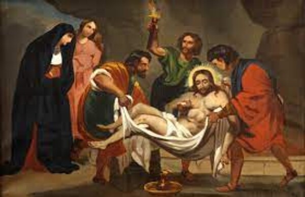 Nadat Jezus zijn laatste adem uitgeblazen heeft, krijgt een vrome jood, Jozef van Arimatea, van Pilatus de toelating om Jezus’ lichaam van het kruis te halen en te begraven in een familiegraf, uitgehouwen in rotsen. Enkele vrouwen komen met hem mee en bekijken het graf. De evangelist Matteüs geeft hen een naam: moeder Maria en Maria Magdalena. Ze blijven bij het graf zitten bidden.